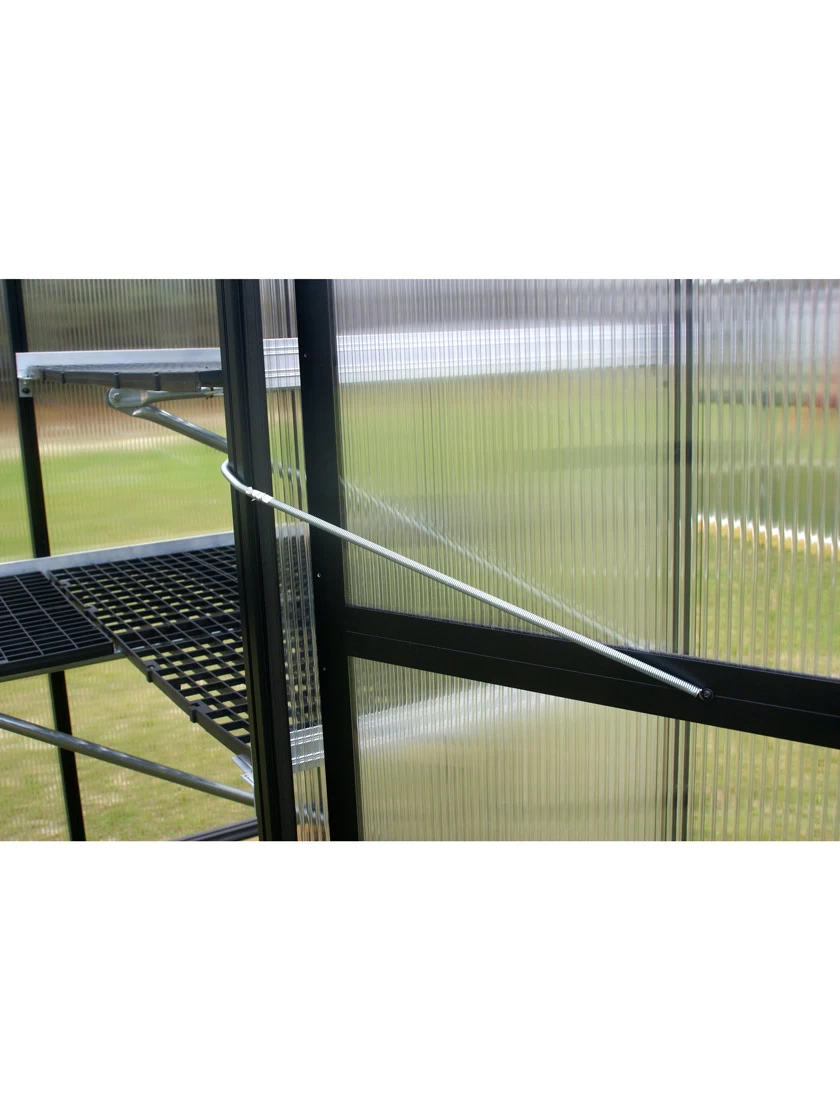 The Growers Edition comes standard with our commercial electric exhaust fan system with built-in louvers and commercial thermostat, to help control the temperature inside your MONT Greenhouse. Other features include a folding workbench system, a drip irrigation system (customized up to 48 dripper heads) with programmable timer, a 17,000 BTU commercial heater with built-in thermostat, and dual automatic roof vent openers.