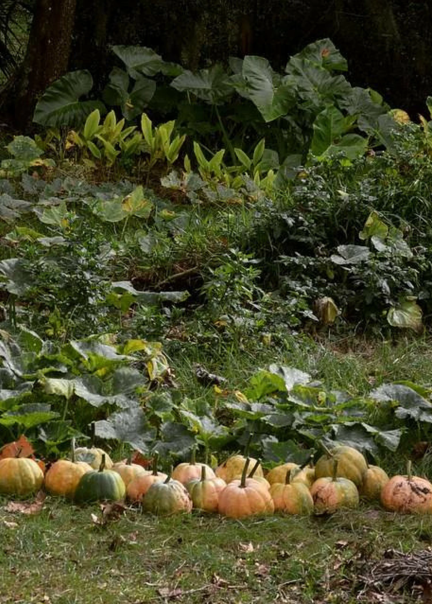 Seminole Pumpkin is one of our favorite annual plants to grow in the Sow Exotic food forest. Extremely heat tolerant and low-maintenance, Seminole Pumpkin plants thrive throughout the hot rainy summer. We plant every year in early summer, when it’s raining heavily, harvest in the fall/winter, and enjoy Seminole Pumpkins all year long. Fruit can weigh up to around 10 lbs and lasts for up to a year at room temperature.