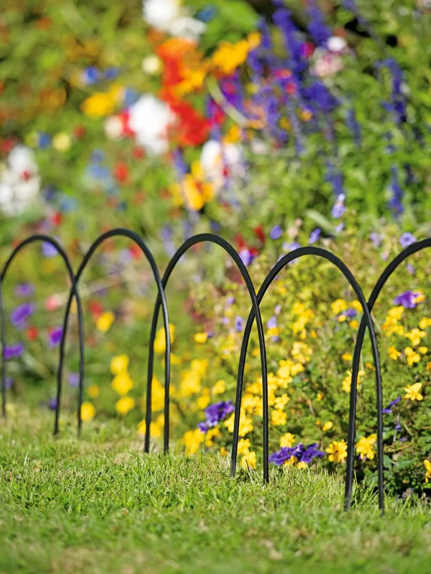 Based on a design found at Shakespeare’s garden in Stratford, England, these border edge irons are perfect for holding back unruly plants and defining the edge of a garden or walkway. Place them side-by-side or overlap them as much as you’d like. Easy to install; simply press the legs into the soil. Matte black finish.
