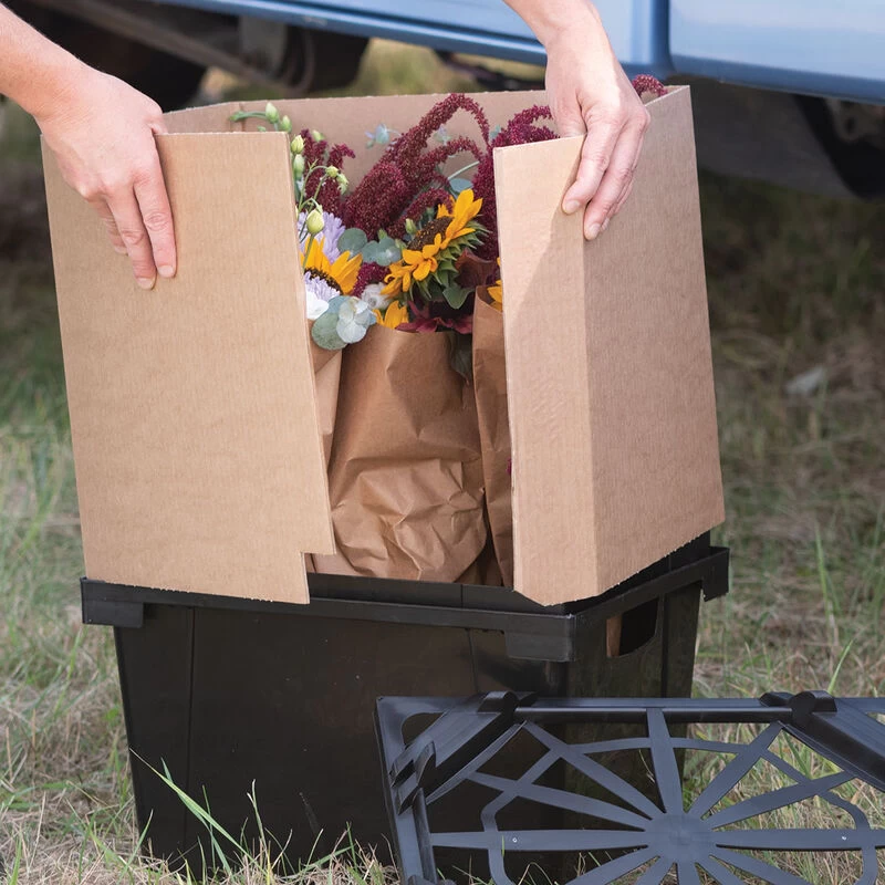 An all-in-one flower harvest, transport, and display system that provides optimal conditions for cut flowers on each leg of their journey. The main components of the Procona System are: 1) a plastic container that can be filled with water and flowers; 2) a cardboard collar for increasing height and protecting blooms during transport; 3) and a ventilated lid that provides a stable base for the next row of stacked containers. The small container footprint allows for high loading capacity, and the side and top ventilation allows all flowers to receive adequate air flow to stay fresher longer. Once flowers arrive at market, simply remove collars and lids for a beautiful display. A variety of sizes and collar heights in two Procona Series (Florida and Valencia) are available to accommodate different flower sizes and stem lengths. Procona containers can also be topped with lids to create professional, reusable vegetable CSA boxes.